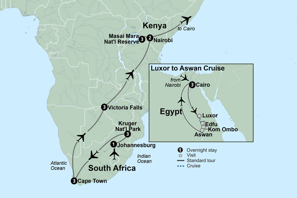 Track the Big 5 in Kenya and South Africa, cruise the Nile, and stand in awe before wonders from Victoria Falls to the Pyramids. Begin in South Africa, where thrilling safaris in Kruger and panoramic views from Cape Town’s Table Mountain await. In Zimbabwe, feel the spray of Victoria Falls and cruise the Zambezi at sunset. Continue to Kenya’s Maasai Mara for immersive game drives and wildlife encounters on the open plains. Then, journey north to Egypt to explore the Pyramids of Giza, cruise the Nile past ancient temples, and connect with the past at Karnak, Kom Ombo, and Philae. From vibrant cities to untamed wilderness, this journey across Africa blends iconic sights, cultural connections, and unforgettable wildlife encounters.