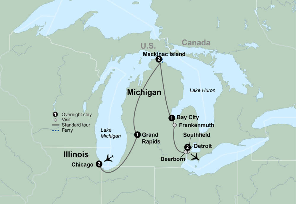 This classic Midwestern tour features Illinois and Michigan. Savor two incredible nights amid the luxury of the Grand Hotel on Mackinac Island. Enjoy a horse and buggy tour of Mackinac Island. Explore the wonderful city of Chicago with a local guide. Visit the Bavarian-influenced town of Frankenmuth. In Dearborn, experience the inspirational Henry Ford Museum and view historic homes at Greenfield Village including the famous American workshops of Thomas Edison, Henry Ford and Robert Frost.