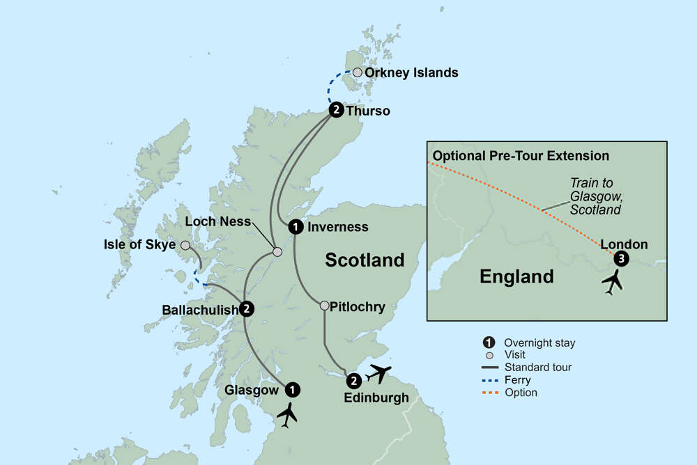 Arrive in Glasgow, Scotland’s Victorian city. With no planned activities today, you can explore Glasgow at leisure. Tonight, your Scottish adventure begins with a visit to a local restaurant. After experiencing a piping demonstration and lesson with a renowned piper, join your fellow travelers for a lively welcome dinner at the restaurant.