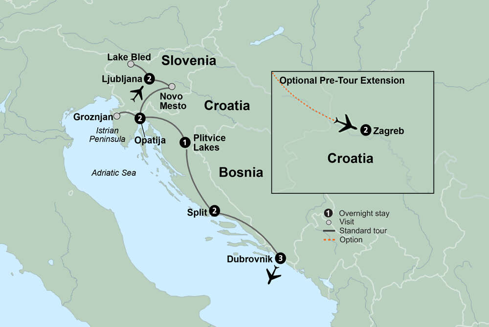 Dive into beauty and history as you explore the medieval cities, tranquil lakes, stunning coastlines and quaint villages of Croatia and Slovenia. Explore Ljubljana, Slovenia’s romantic capital city. Discover the richness of Opatija, the “Riviera of Croatia” and an Istrian gem. Explore Plitvice Lakes National Park by foot and by boat, a place where waterfalls cascade down sheer cliffs connecting sixteen pristine lakes. Step back into Roman times in Split’s Diocletian’s Palace. Enjoy visits to local restaurants, wineries and artisanal food producers. Take in the white stone buildings and massive city walls of the ancient harbor town of Dubrovnik. Delight in the old-world charm found in this sunny Adriatic paradise.