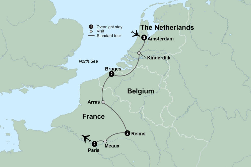 From iconic Dutch windmills and cozy Belgian streets to the world-renowned Champagne region and the “City of Light,” experience the essence of three European countries. Connect with deeply rooted cultures as you make your way through the Netherlands, Belgium, and France.